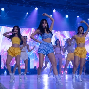 «A dynamic scene of a popular K-pop girl group showcasing their s...»