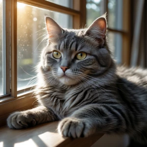 «Generate an image of a majestic grey tabby cat lounging beneath...»